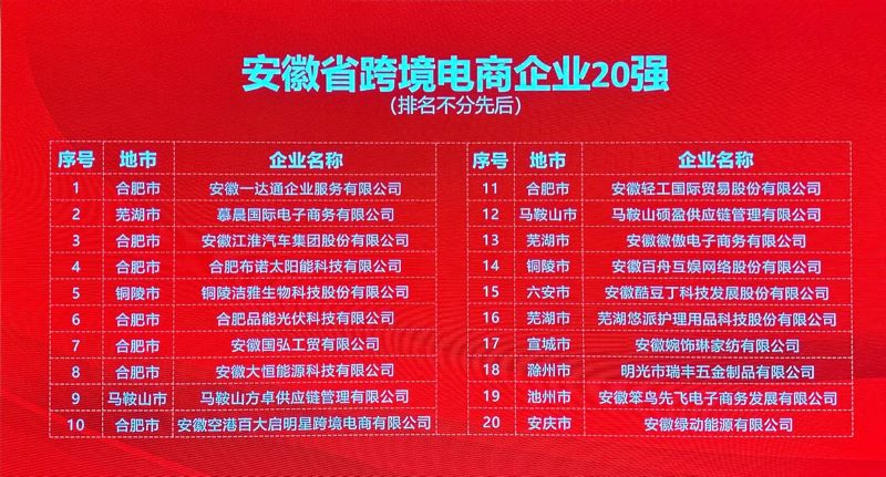 公司榮獲“安徽省跨境電商企業20強”,公司及合肥大中均被列入“安徽省百家優秀跨境電商企業名錄”。