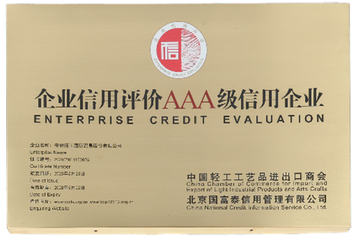 近日,2025年度首批輕工行業企業信用等級評價結果正式揭曉。中國輕工工藝品進出口商會秉承“公開、公平、公正、科學”的原則,組織開展了此次評價活動。經嚴格評審,全國共有157家企業獲評A級以上(含A級)信用等級,其中,生產型企業84家,貿易型企業73家。我司成功斬獲貿易類“AAA級信用企業”最高等級認證!